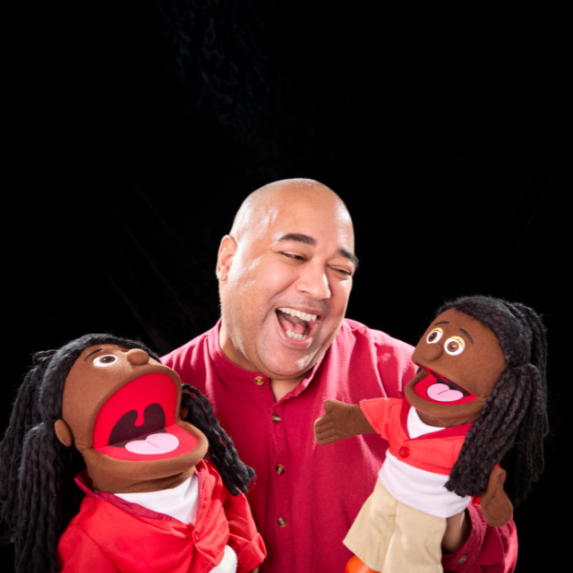 Image: Photo of Velvet and two puppets, all smiling and wearing red; Photo: Melody Maloney Photography